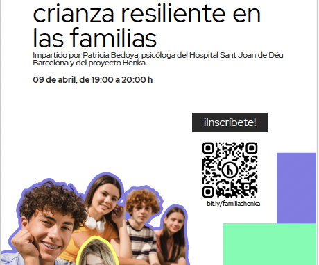 En el marco de esta iniciativa, se ofrecerá a las familias del alumnado de ESO la charla online“Fomentando la crianza resiliente en las familias”, impartida por Patricia Bedoya, psicóloga del Hospital Sant Joan de Déu de Barcelona y miembro del proyecto Henka, que se celebrará el próximo 9 de abril de 19:00 a 20:00 h
