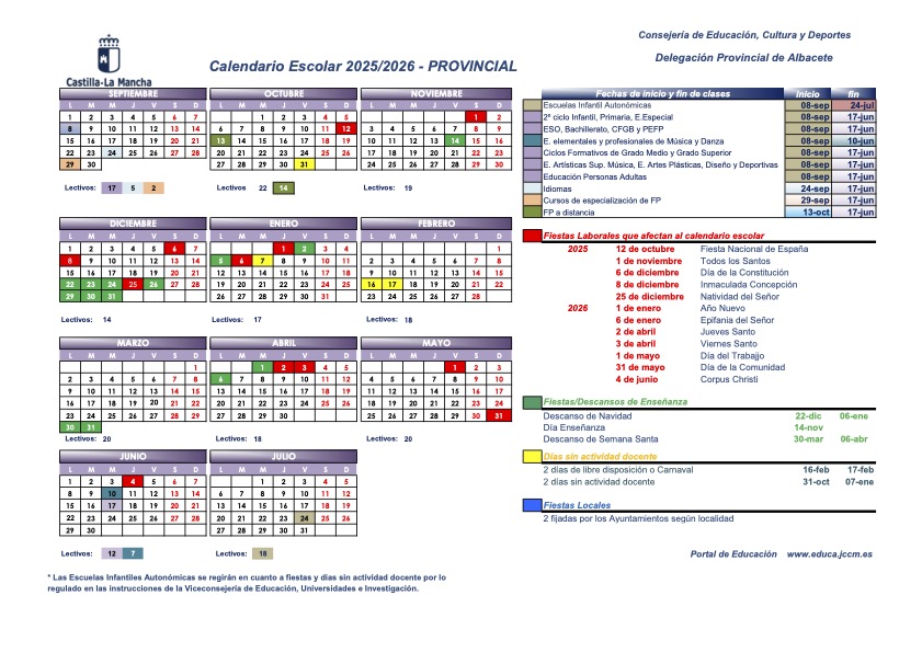 En nuestra localidad, los dos días de festivos lácales son el 29 de septiembre (lunes) y en reunión del Consejo Escolar Municipal, se estableció el día 4 de mayo de 2026 (lunes), que se correspondería con el festivo local de la Virgen de La Nieves por caer en agosto.