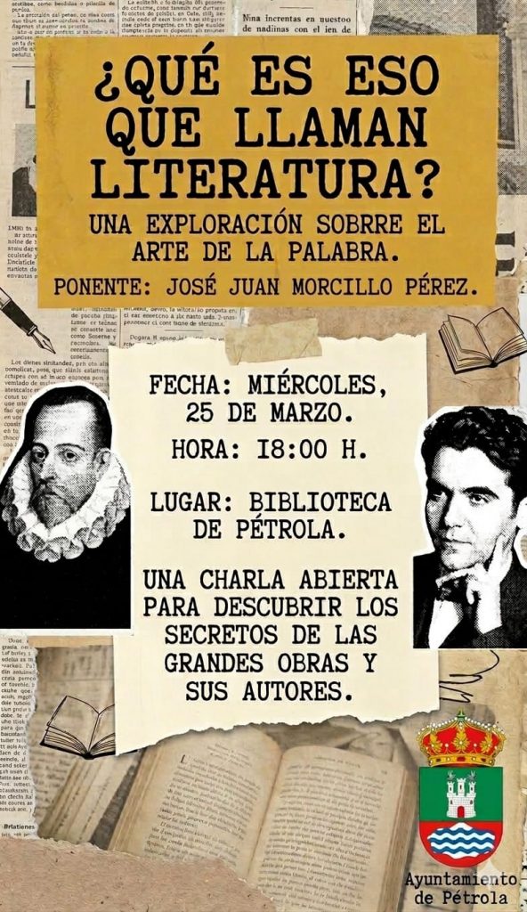 Dentro del Plan de Lectura del IESO «Cinxella» de Chinchilla, en colaboración con el resto de bibliotecas que formamos parte de esta mancomunidad educativa de Secundaria para el fomento de la lectura y de la divulgación cultural, el 25 de marzo, a las 18,00 h, el responsable de este Plan impartirá en la Biblioteca de Pétrola una charla titulada «¿Qué es eso que llamamos literatura»?, dirigida a todo el público.